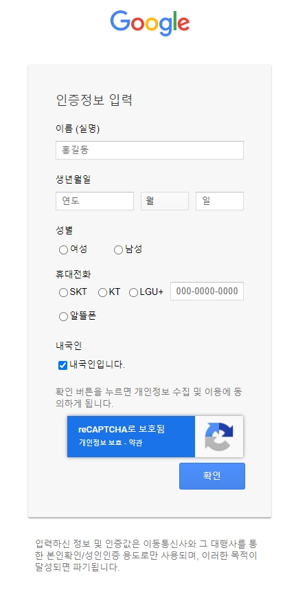 인증 버튼을 클릭하면 이름·생년월일·성별·내국인 여부·한국 휴대전화 정보 입력창으로 이동합니다. 각 항목에 정확한 정보를 입력한 뒤 확인 버튼을 클릭하여 다음 단계로 진행합니다. 단, 한국 휴대전화 번호만 인증에 사용 가능하므로 외국 번호는 사용할 수 없습니다.