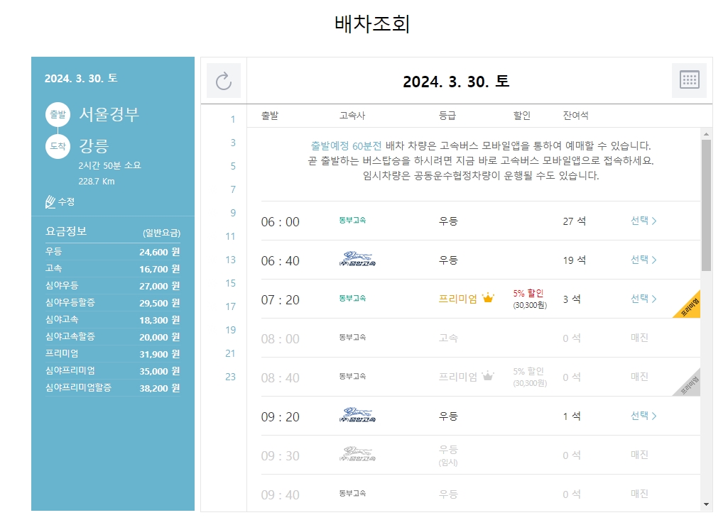 6. 조회된 시간표에는 첫차부터 막차까지 남은 좌석 수가 함께 표시됩니다. 좌석 가격과 운행 시간을 한눈에 확인할 수 있습니다. 이른 아침과 심야 시간 운행 간격이 넓을 수 있어 단, 요일 및 계절에 따라 배차 간격이 달라질 수 있으니 유의하세요.