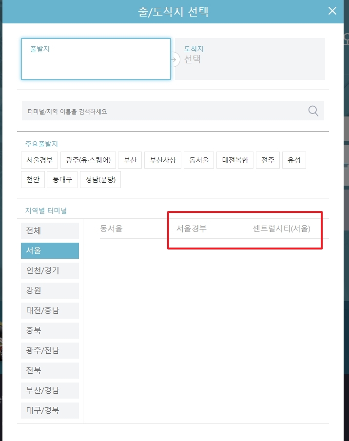 3. 출발지 선택에서 ‘서울’ 클릭 후 서울경부와 센트럴시티가 나타납니다. 모바일 환경에서는 메뉴 구조가 달라 스크롤이 필요할 수 있으니 화면을 충분히 살펴보세요.