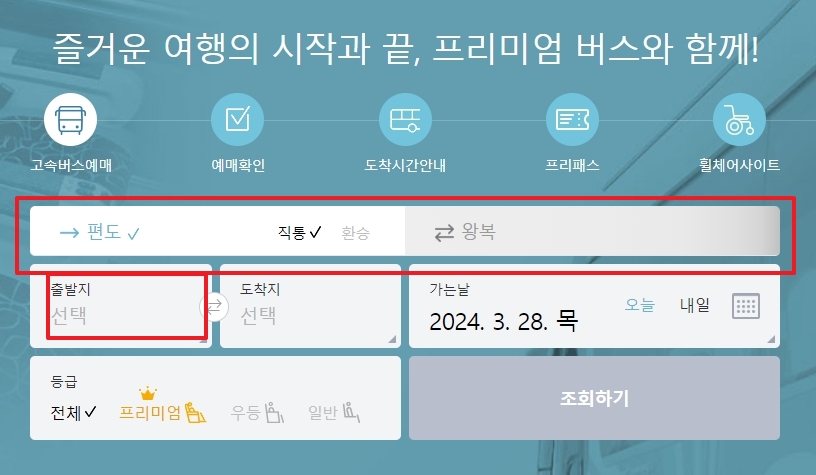 2. 편도와 왕복 중 하나를 선택합니다. 단, 왕복 예매 시에는 출발과 돌아오는 일정이 동시에 예약되어 좌석 가용성이 달라질 수 있어 경우에 따라 편도 별도 예매가 유리합니다. 직통 또는 환승 옵션을 통해 원하는 경로를 설정할 수 있습니다.