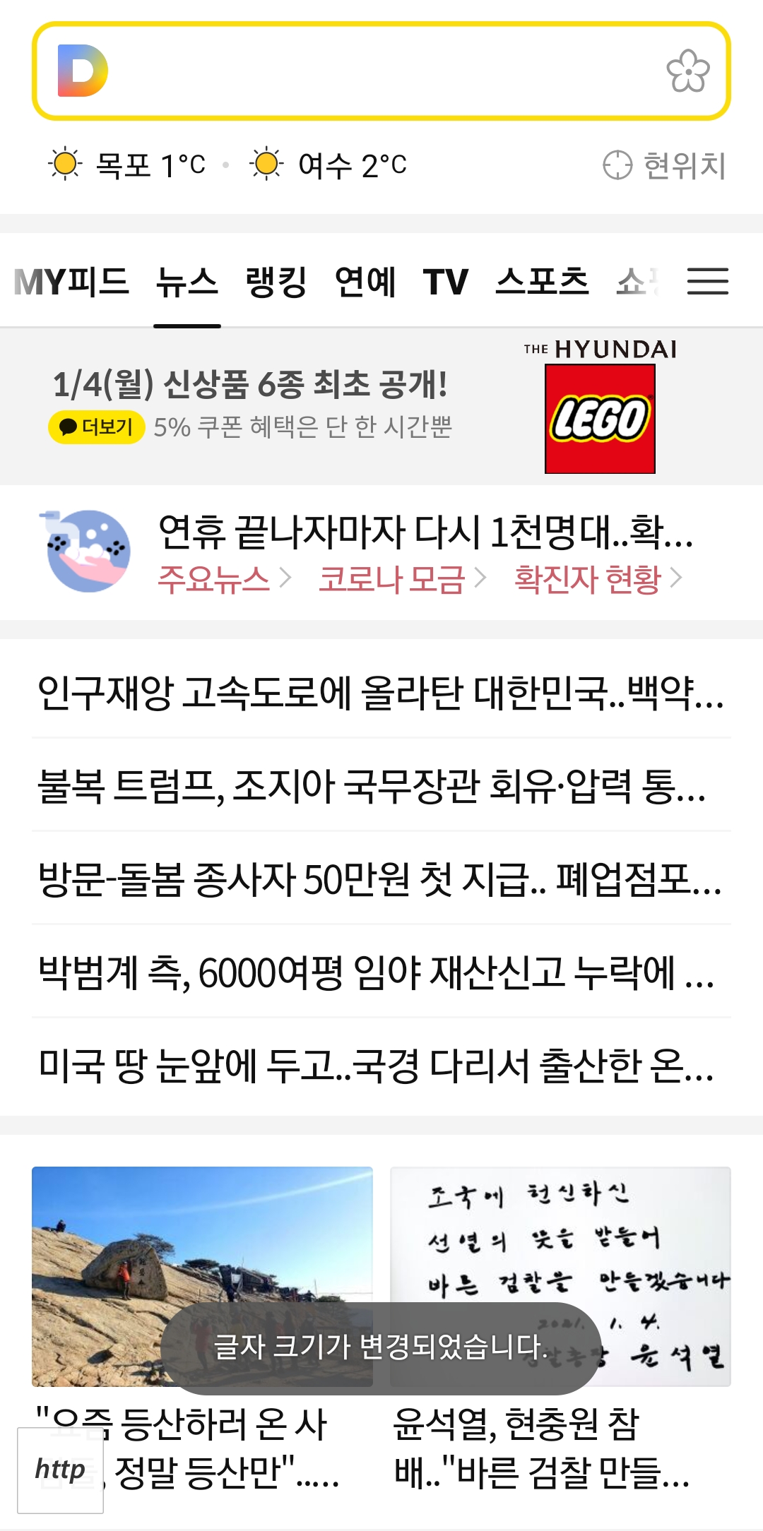다음 애플리케이션에서는 모바일 환경에서 우측 상단 메뉴의 가+ 버튼을 통해 두 가지 글자 크기를 선택할 수 있습니다. PC 웹사이트에서는 브라우저 설정의 단축키나 마우스 휠을 활용해 100%부터 최대 500%까지 글자 크기를 자유롭게 조절할 수 있습니다.