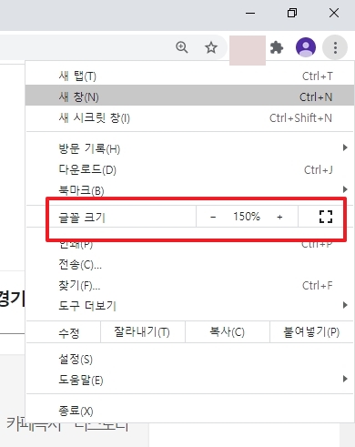 3. PC 웹 브라우저의 메뉴에서 글꼴 크기 조절 옵션을 찾아 다양한 확대·축소 단계를 선택할 수 있습니다.