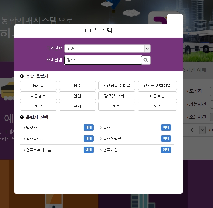 터미널명 청주를 검색하면, 남청주, 청주, 청주공항, 청주대정류소, 청주북부터미널, 청주사창 등 여러 옵션이 나타납니다. 여기서 본인이 출발하려는 터미널을 선택합니다.