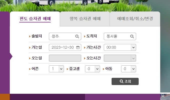 선택한 출발지에 이어 도착지, 출발 날짜 및 시간을 선택한 후 조회 버튼을 클릭합니다. 이를 통해 원하는 날짜와 시간대의 버스 시간표를 조회할 수 있습니다.