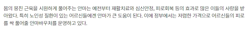 안마가 증상의 호전과 피로 회복에 어떻게 도움이 될 수 있는지에 대한 정보를 제공합니다. 이 부분은 신체적 부담이나 건강 문제가 있는 사람들이 안마를 받을 때 얻을 수 있는 이점에 대해 설명합니다. 하지만 안마 서비스를 받기 위해서는 일정한 금액적 부담이 있을 수 있으며, 이것이 바로 안마 바우처 프로그램이 중요한 이유입니다.