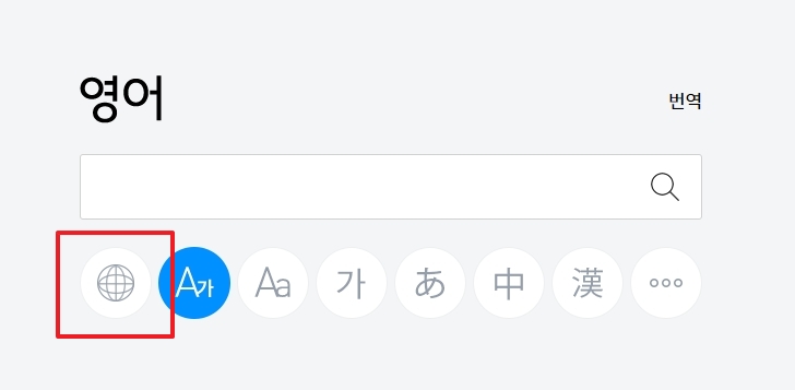 7. 상단의 지구 모양 아이콘을 클릭하면 다양한 언어 사전을 통합 검색할 수 있는 기능이 활성화됩니다.