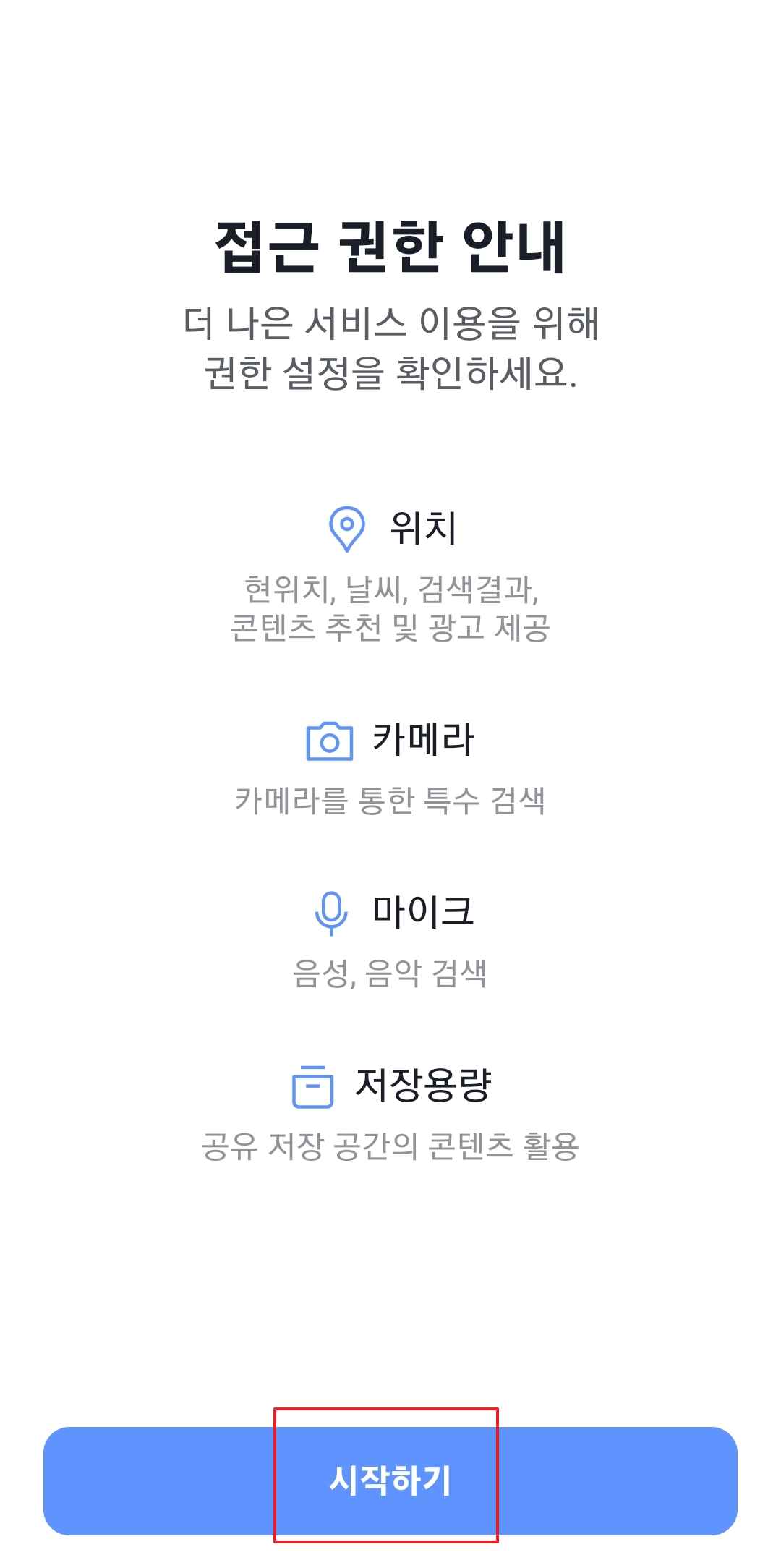 6. 건너뛰기를 누르면 카메라 및 저장공간 접근 권한 요청 화면이 나타납니다. 여기서 시작하기 버튼을 선택해 주시면, 앱이 즉시 카메라 기능에 접속해 실시간 촬영을 시작할 수 있게 됩니다. 이 권한이 없으면 꽃 검색 기능 이용이 제한될 수 있습니다.