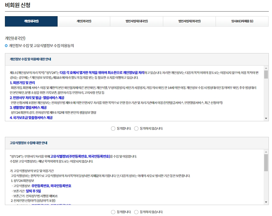 비회원으로 신청할 경우, 약관에 동의하고 개인정보를 입력한 다음 다음 단계로 넘어갑니다. 이 과정은 로그인 없이도 신청이 가능하다는 것을 의미합니다.