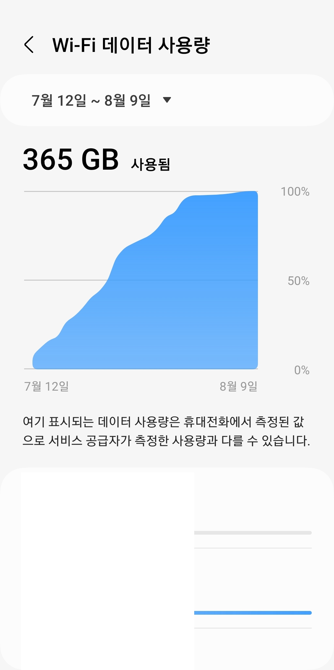 데이터 사용량 화면을 아래로 쭉 내려보면 모바일 데이터뿐만 아니라 와이파이(Wi-Fi) 사용량도 함께 확인할 수 있답니다. 저는 며칠 사이에 데이터는 조금 썼지만 와이파이는 무려 365GB나 썼네요. 이렇게 와이파이를 적극적으로 활용하면 소중한 모바일 데이터를 아낄 수 있으니, 와이파이가 되는 곳에서는 꼭 켜두는 습관을 들이는 게 좋아요.