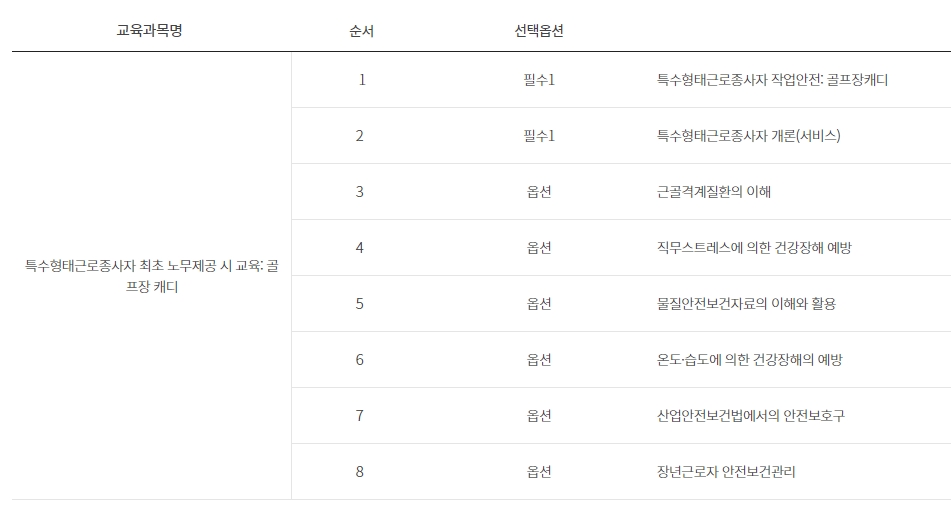 교육 과목들을 살펴보면 정말 일하면서 꼭 필요한 내용들로 꽉 차 있어요. 필수 과목으로는 골프장 캐디의 작업 안전처럼 특정 직업에 대한 내용이 들어있고, 서비스를 제공하는 근로자라면 공통적으로 알아야 할 내용도 포함되어 있다고 해요. 그리고 선택 과목도 아주 흥미로운데요. 일하면서 받는 스트레스를 어떻게 관리하는지에 대한 직무스트레스 예방 방법이나, 위험한 물질을 안전하게 다루는 법, 건강을 해치는 요인들을 미리 막는 방법 등 정말 유용한 과목들이 많습니다. 내게 필요한 과목을 골라서 들으면 되니까 정말 실용적이에요.