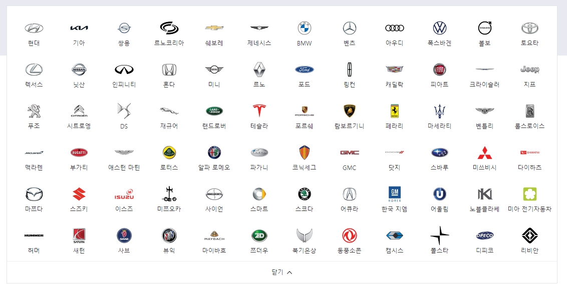 여기서는 정말 많은 제조사들을 한 번에 볼 수 있습니다. 현대나 기아 같은 국산차도 물론이고, 우리가 흔히 아는 BMW, 벤츠, 아우디 같은 독일차 브랜드부터 생소한 이름의 브랜드까지 전부 다 나와요. 이 중에서 내가 궁금했던 수입차 브랜드를 하나 골라서 클릭해보면 그 브랜드의 자동차들만 따로 모아서 볼 수 있습니다.
