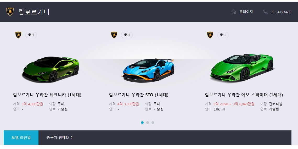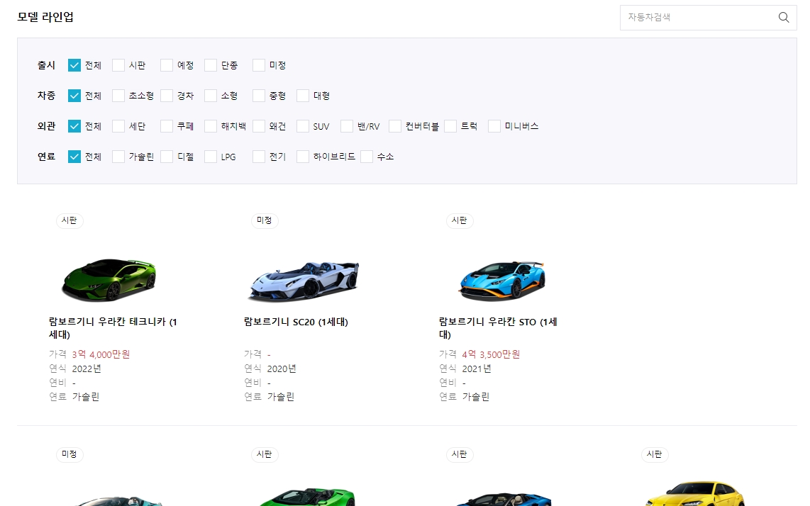 저는 꿈의 차라고 불리는 람보르기니를 선택해봤는데요. 이렇게 특정 브랜드를 선택하고 나면, 해당 브랜드에서 만들고 있는 자동차 모델들이 쭉 나타납니다. 보통은 가장 최근에 출시되었거나 인기가 많은 모델들이 화면 위쪽에 먼저 보이는 경우가 많아요. 사진만 봐도 정말 멋지다는 생각이 드네요.