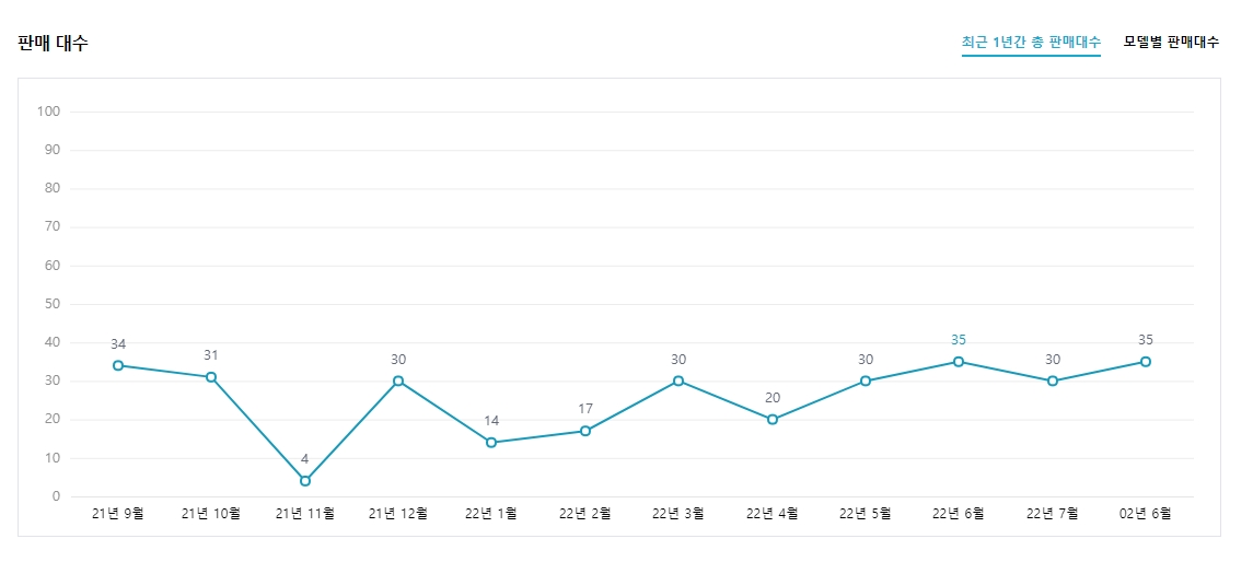 화면을 조금만 아래로 내려보면 재미있는 정보도 볼 수 있는데요. 최근 1년 동안 각 모델이 총 몇 대나 팔렸는지 판매량을 보여주는 부분입니다. 제가 고른 브랜드는 워낙 고가의 차량이다 보니 역시나 1년 동안 국내에서 판매된 대수가 그렇게 많지는 않은 것을 확인할 수 있었어요. 월별로 판매량이 어떻게 변하는지도 볼 수 있네요.