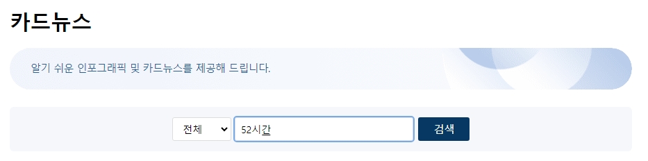 그래서 화면에 보이는 검색창을 활용하는 것이 편리합니다. 검색창에 궁금한 핵심 단어인 '52시간'이라고 입력하고 검색 버튼을 누르면, 이와 관련된 자료들만 따로 모아서 볼 수 있어요.