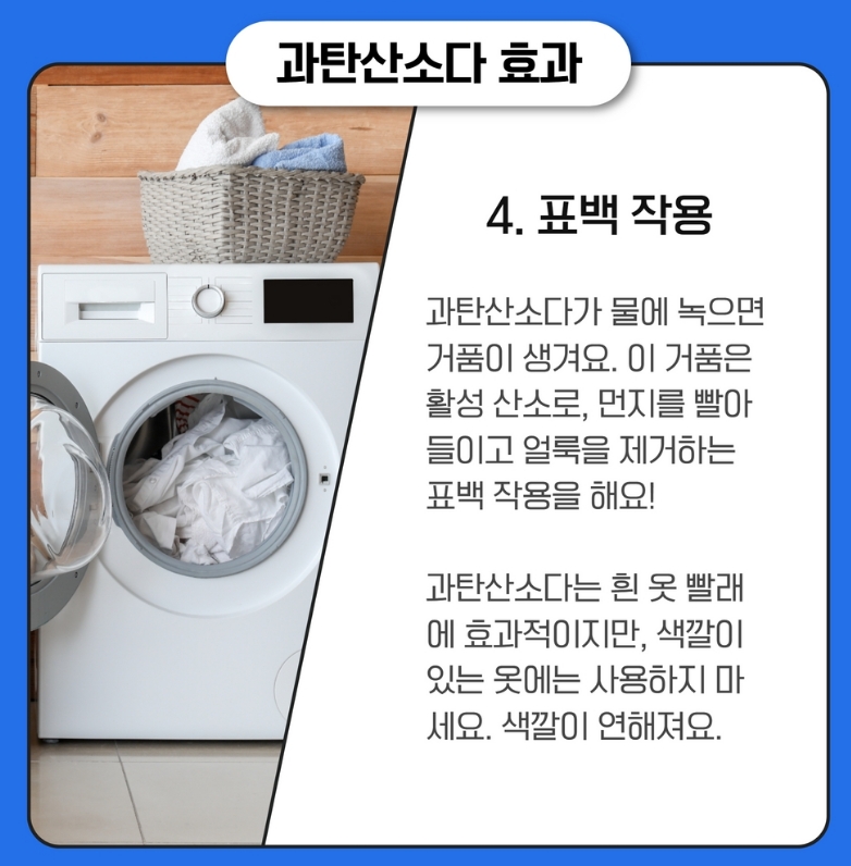 흰옷이나 수건을 더 하얗고 쨍하게 만들고 싶을 때 표백 효과를 위해 과탄산소다를 사용해보세요. 우리가 보통 아는 락스 같은 염소계 표백제는 옷감을 상하게 할 수 있지만, 과탄산소다는 산소계 표백제라서 옷감 손상은 훨씬 적으면서 표백 효과는 확실하답니다.