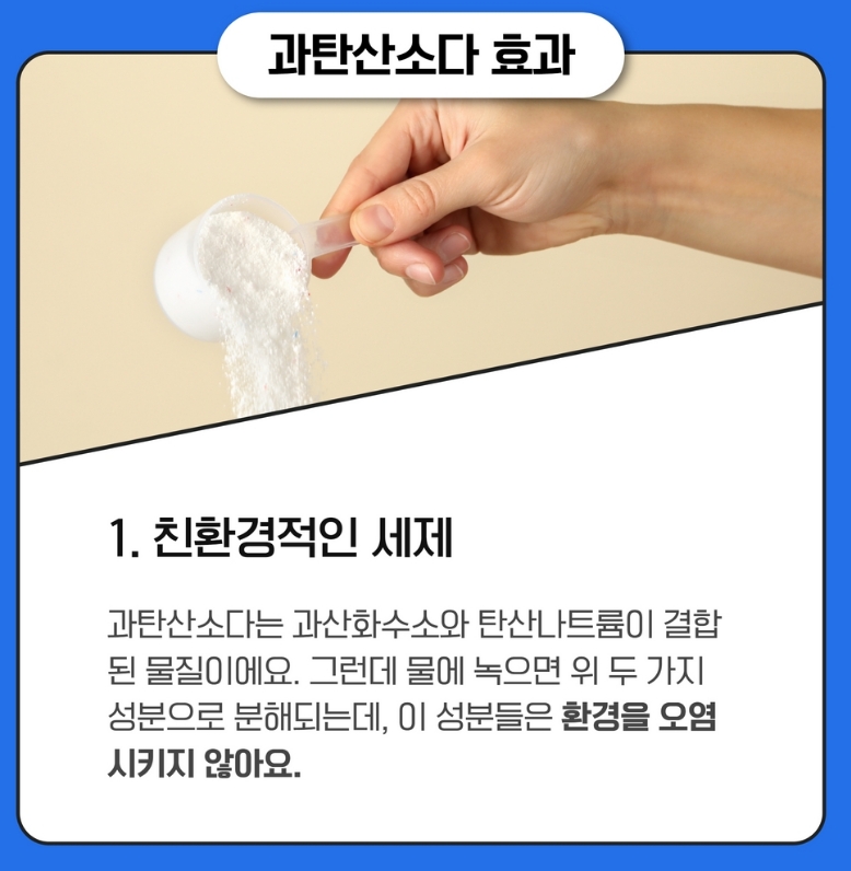 과탄산소다의 가장 큰 장점 중 하나는 바로 친환경 세제라는 점입니다. 독한 화학 성분이 들어간 공산품 세제들과는 다르게 우리 몸과 자연에 훨씬 안전한 선택지가 될 수 있습니다.