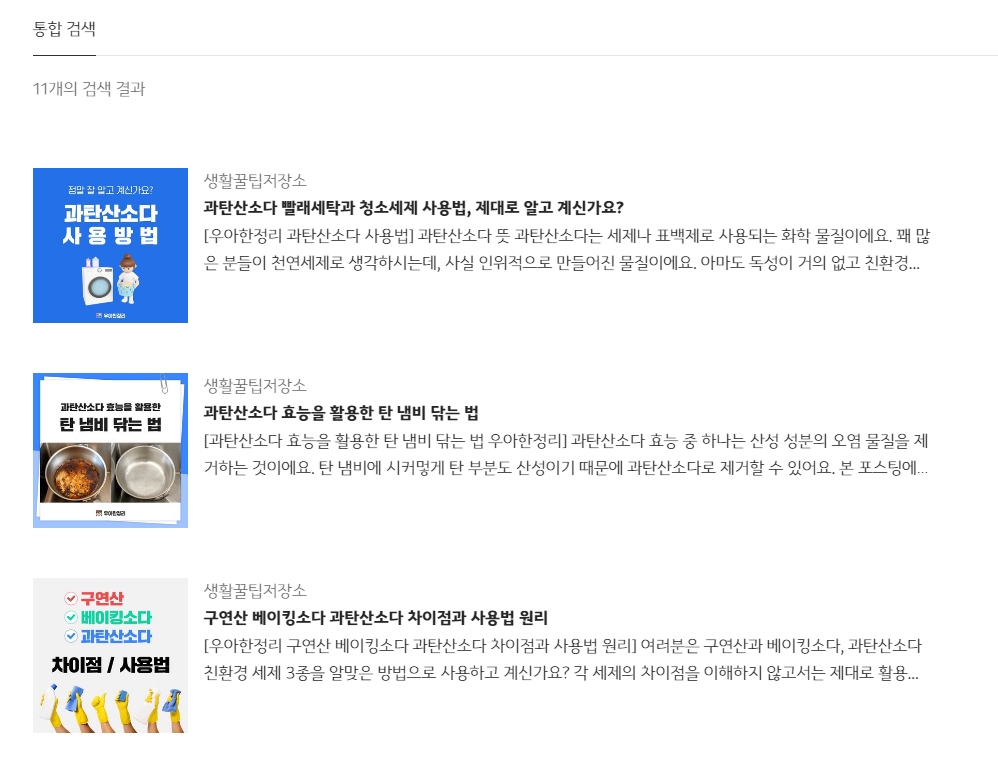 이렇게 직접 검색을 하면 과탄산소다와 관련된 여러 게시물들이 목록으로 나타나서 한눈에 보기 편하답니다.