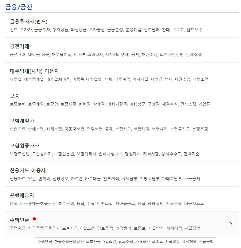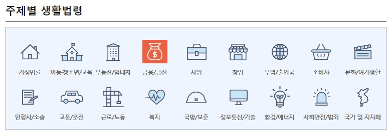 주제별 목록이 나오면 여러 가지가 보일 텐데요, 주택연금은 돈과 관련된 내용이니까 당연히 '금융/금전' 항목을 선택해야겠죠? 이 항목 안에는 금융거래나 돈과 관련된 다양한 법률 정보가 모여 있어서, 주택연금뿐만 아니라 다른 금융 관련 정보가 필요할 때도 아주 유용하게 쓸 수 있습니다.