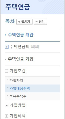 상세 정보 페이지로 들어오면 화면 왼쪽에 목차가 보일 겁니다. 이 목차를 이용해서 원하는 정보로 바로 이동할 수 있는데요. 우리는 가입할 수 있는 주택의 기준이 궁금하니까, '주택연금 가입' 아래에 있는 '가입조건', 그리고 그 밑에 있는 '가입대상주택'을 차례대로 눌러주면 됩니다. 그러면 바로 관련 내용이 화면에 나타납니다.