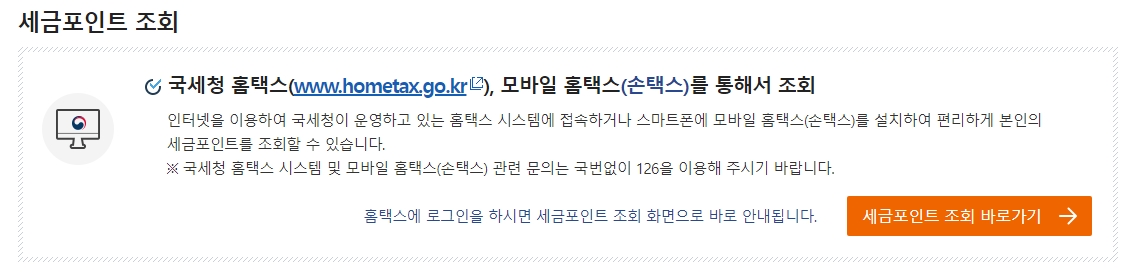 그렇다면 내가 지금 가지고 있는 세금 포인트는 몇 점이나 될까요? 이 점수를 확인하려면 다른 곳으로 이동해야 한다고 안내되어 있습니다. 바로 국세청에서 직접 운영하는 '홈택스' 홈페이지나, 스마트폰에서 사용하는 '손택스'라는 어플을 통해서 조회가 가능합니다.