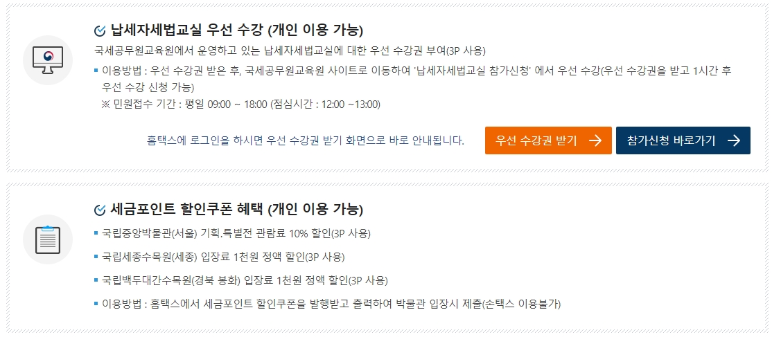 이 밖에도 세금 포인트로 누릴 수 있는 혜택은 정말 다양합니다. 국세청에서 운영하는 '세법 교실'에 우선적으로 수강할 수 있는 기회를 얻거나, 국립중앙박물관의 기획 전시를 무료로 관람하고, 국립세종수목원 입장료를 할인받는 등 문화생활에도 포인트를 쓸 수 있습니다. 성실하게 세금을 납부한 것에 대한 보답으로 주어지는 이런 소소하지만 확실한 혜택들을 잘 챙겨서, 우리의 일상을 좀 더 풍요롭게 만들어보는 것은 어떨까요?