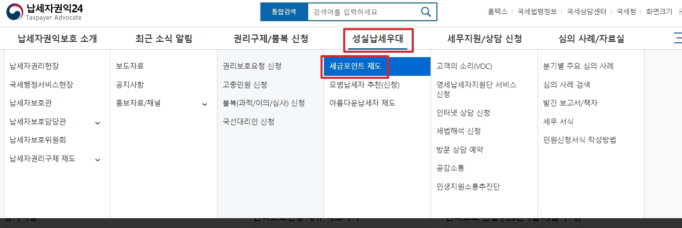 '납세자 권익24' 홈페이지에 접속하면 여러 가지 메뉴들이 보입니다. 그중에서 우리는 세금 포인트에 대해 알아볼 것이기 때문에, 상단 메뉴에 있는 '성실납세우대'라는 글자에 마우스를 가져가 봅니다. 그러면 아래로 작은 메뉴들이 펼쳐지는데, 거기서 '세금포인트제도'를 선택해서 들어가면 됩니다.