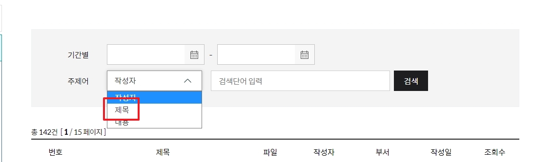 이때 검색 조건을 '제목'으로 설정해야 관련 공지사항을 정확하게 찾을 수 있습니다. 간혹 기본 설정이 '작성자'로 되어 있어 검색 결과가 나오지 않는 경우가 있으니, 검색 전 조건을 반드시 확인하시길 바랍니다.