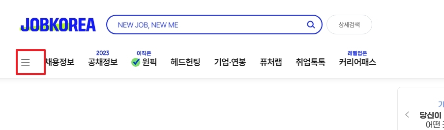 화면에 보이는 것처럼 메인 페이지에 도착했다면, 다음 단계로 넘어가기 위해 좌측 상단에 위치한 세 줄 모양의 전체 메뉴 아이콘을 찾아 눌러주세요. 이 아이콘을 통해 숨겨진 메뉴들로 접근할 수 있습니다.