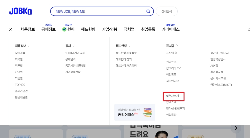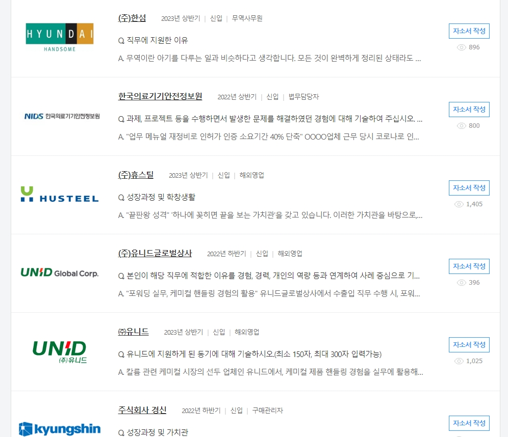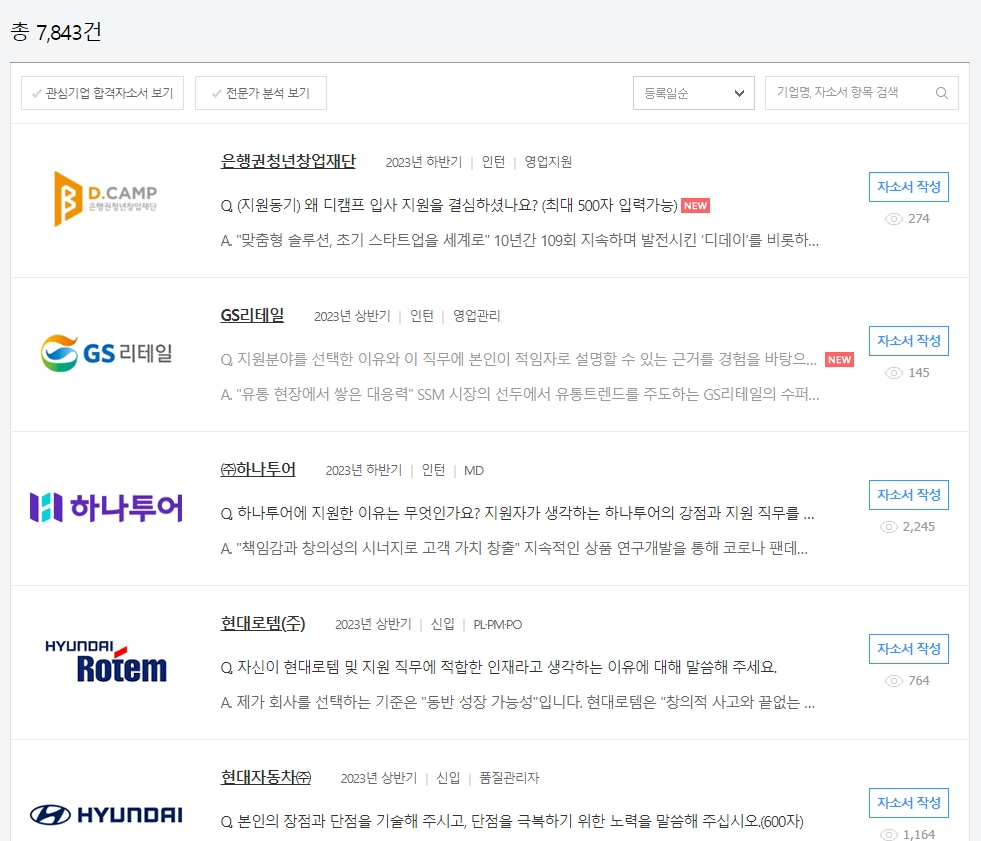 이 메뉴는 실제 기업들의 채용 과정에 최종 합격한 지원자들의 자기소개서를 모아놓은 곳입니다. 막막하게 느껴졌던 자기소개서 작성을 시작하는 데 있어 훌륭한 길잡이가 되어줄 수 있으니, 주저하지 말고 클릭하여 다음 화면으로 이동해 주세요.