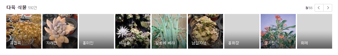 페이지 상단에 위치한 검색창에 '다육이'라고 입력하고 검색 버튼을 누르면, 관련된 모든 정보를 보여줍니다. 식물의 이름 전체를 알지 못하더라도, '선인장'이나 '알로에'처럼 큰 분류로 검색을 시작해볼 수도 있습니다.