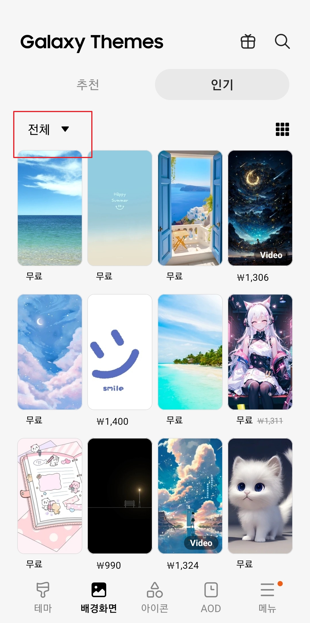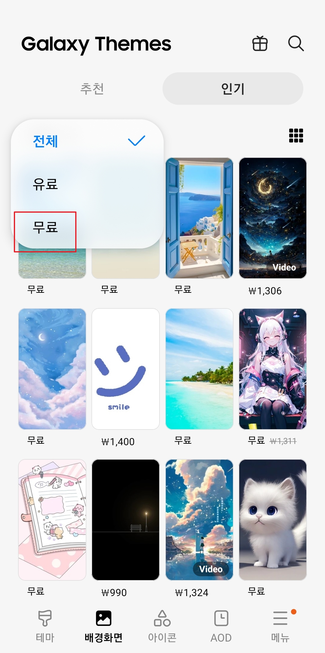 인기 탭에는 유료와 무료 콘텐츠가 섞여 있습니다. 우리는 오직 무료 배경화면만 보고 싶기 때문에, 화면 상단의 '전체' 버튼을 누른 뒤 나타나는 옵션에서 '무료'를 선택해 주세요.