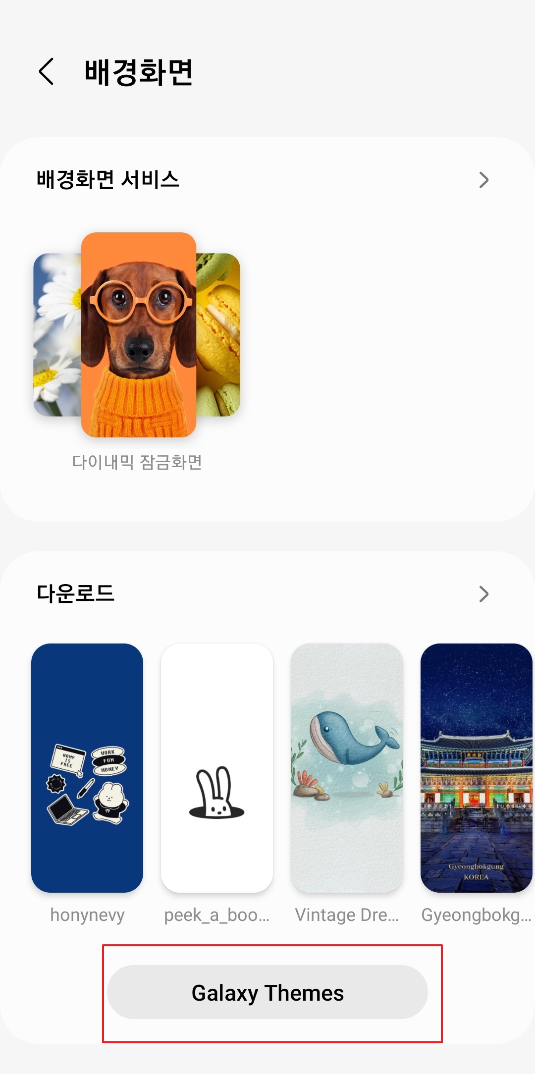 배경화면을 선택할 수 있는 여러 소스가 나타납니다. 내 갤러리의 사진을 선택할 수도 있지만, 더 다양하고 전문적인 이미지를 원한다면 화면을 아래로 내려 'Galaxy Themes' 항목을 선택해 주세요.