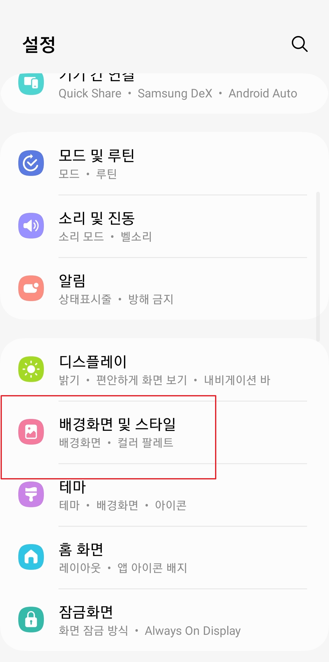 설정 메뉴에 들어오셨다면, 여러 항목 중에서 '배경화면 및 스타일'이라고 적힌 메뉴를 찾아 선택해 주세요. 보통 화면 상단 근처에 위치하고 있어 쉽게 찾으실 수 있습니다.