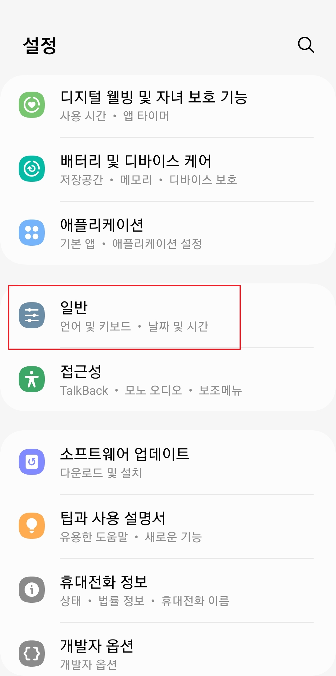 설정 메뉴에 들어왔다면 화면을 아래로 조금 내려 '일반' 항목을 찾아야 합니다. '일반' 메뉴는 언어, 날짜 및 시간, 키보드 등 휴대폰의 기본적인 기능들을 관리하는 곳입니다. '일반'을 찾았다면 가볍게 터치하여 다음 단계로 이동합니다.
