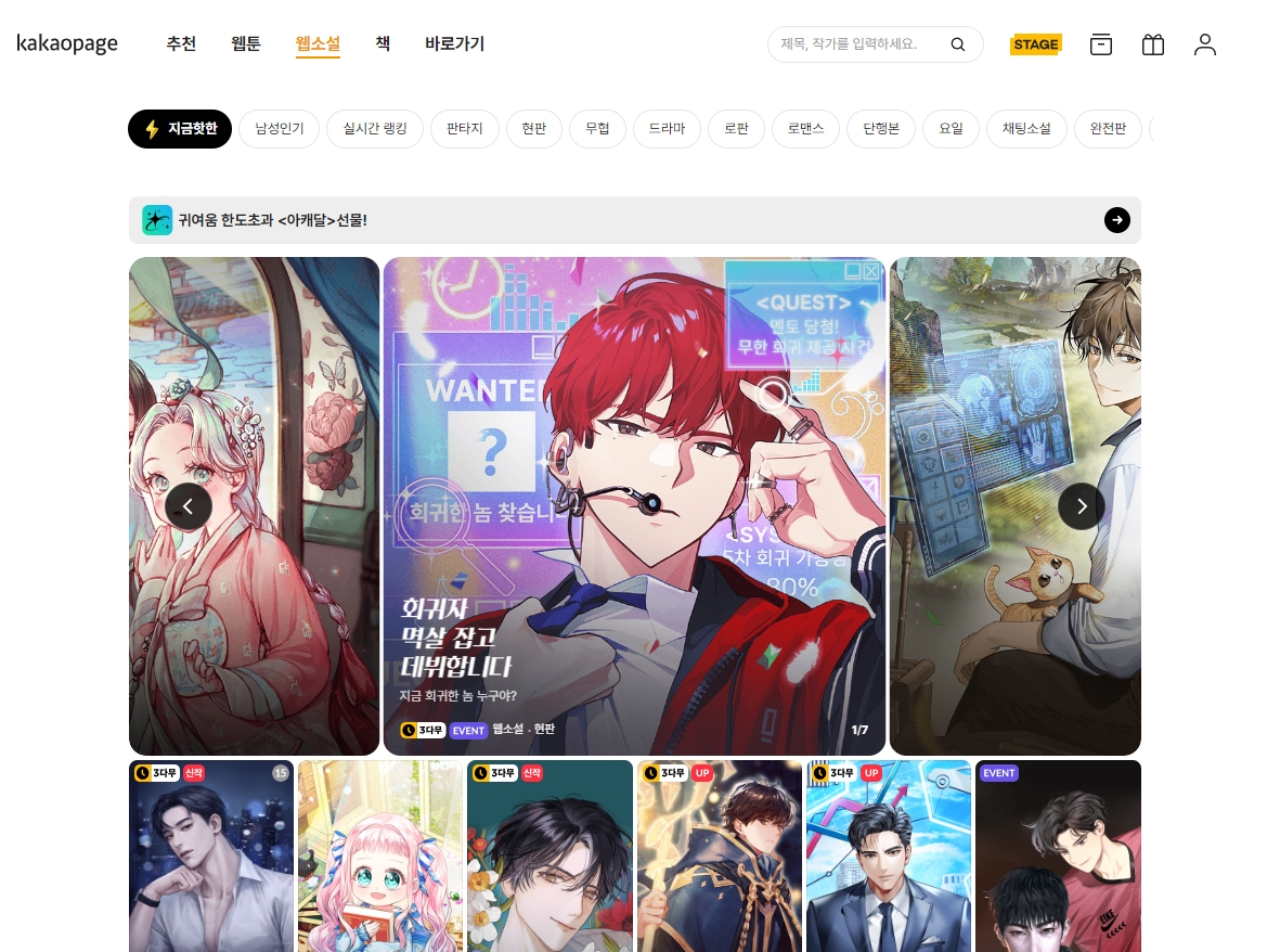 홈페이지 상단 메뉴를 보면 웹툰, 웹소설, 책 등 주요 콘텐츠로 바로 이동할 수 있는 링크가 마련되어 있습니다. 마우스를 이용해 원하는 메뉴를 클릭하면, 해당 장르의 인기 작품이나 최신 업데이트 작품 목록을 한눈에 확인할 수 있습니다.