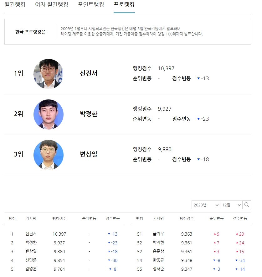 프로랭킹에서는 신진서, 박정환, 변상일 순으로 선수들이 랭크되어 있습니다.