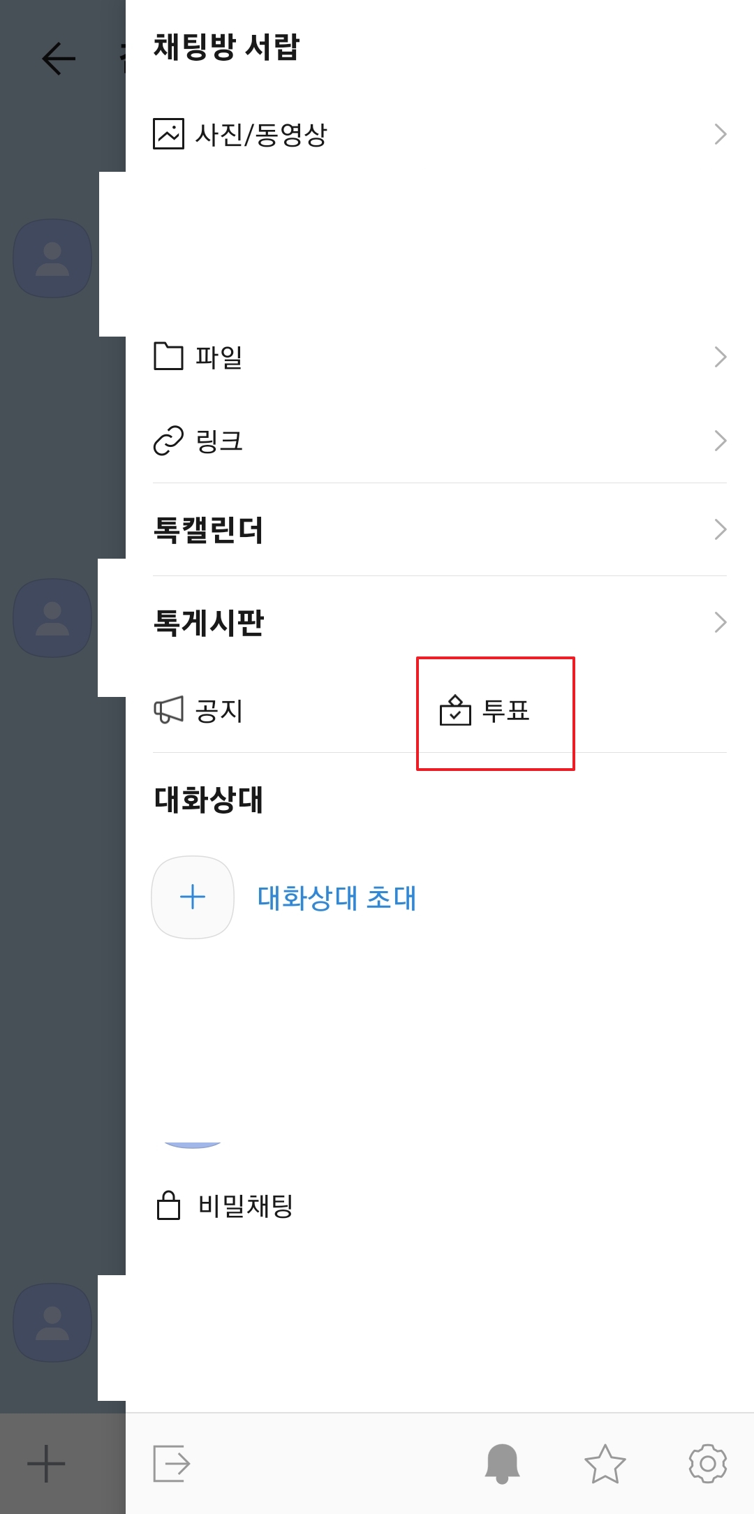 메뉴 아이콘을 누르면 '채팅방 서랍'이라는 공간이 열립니다. 여기서는 대화 내용 검색은 물론, 사진이나 파일도 모아볼 수 있지요. 우리가 사용할 기능은 바로 '투표'입니다.