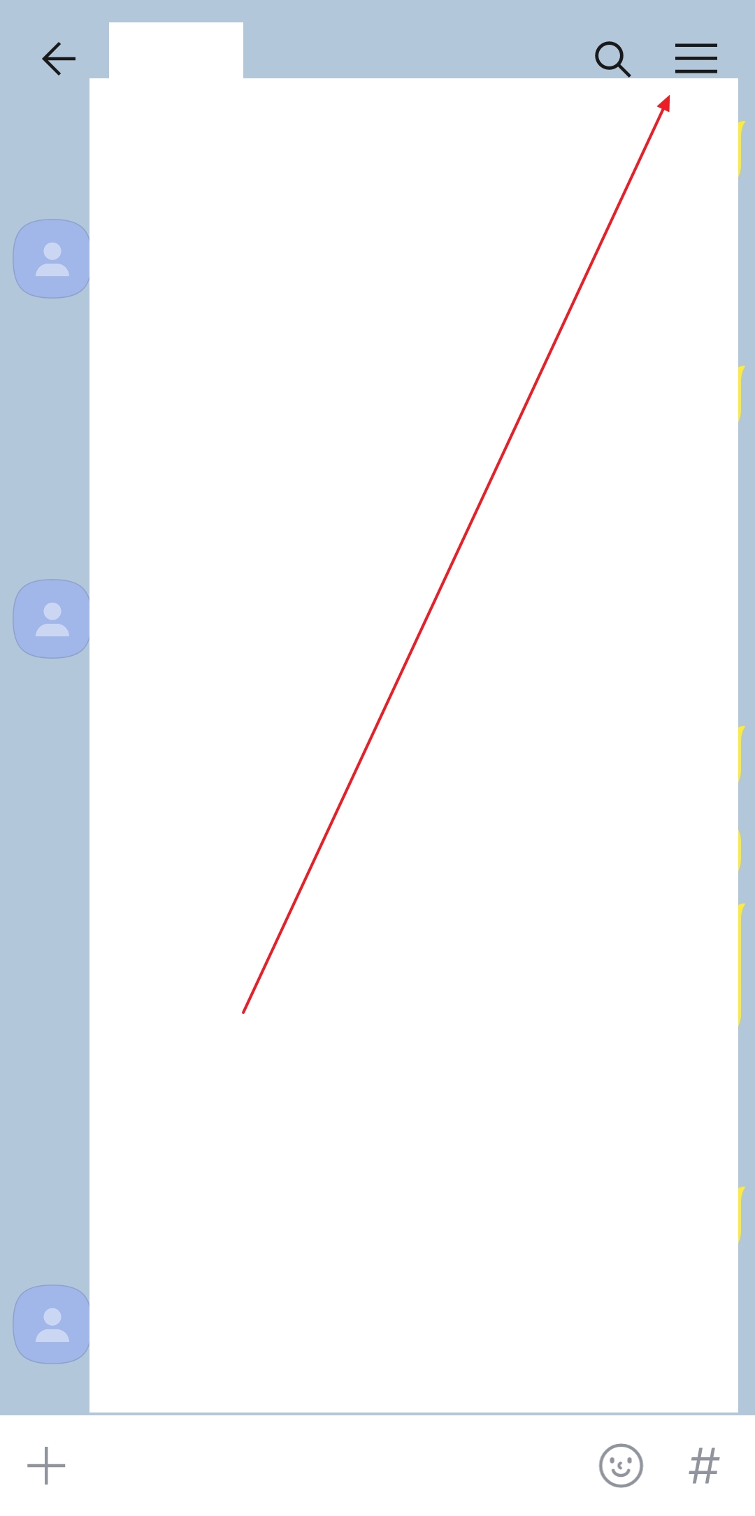 대화방에 들어오셨다면, 이제 화면 오른쪽 맨 위에 있는 세 줄 모양의 아이콘을 찾아 눌러주세요. 이곳에 대화방의 다양한 부가 기능들이 모여 있습니다.