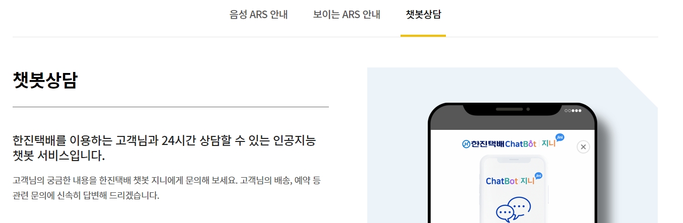 한진택배의 고객지원 페이지에서는 다양한 문의 채널을 안내하고 있습니다. 음성 ARS, 보이는 ARS, 챗봇 상담 등 여러 방법을 제공하여 상황에 맞게 선택할 수 있도록 돕고 있습니다. 각 채널별 운영 시간과 특징이 안내되어 있어 편리합니다.