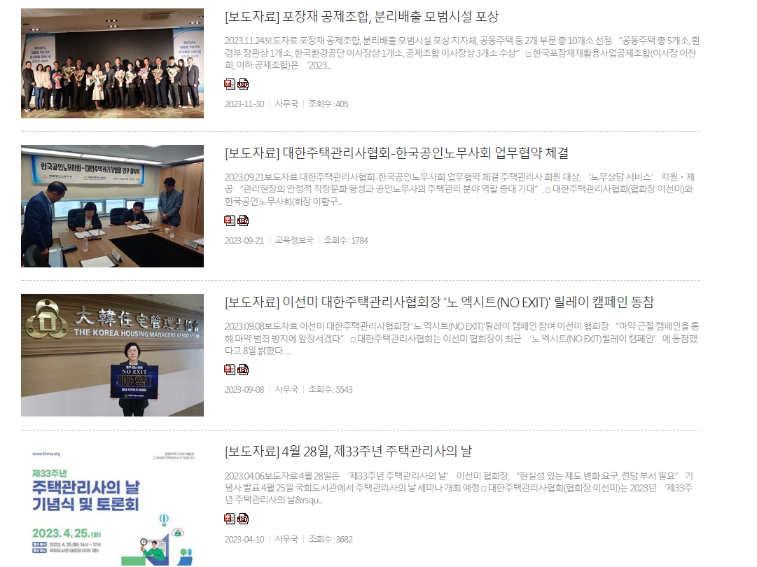 보도자료 섹션에는 사진과 함께 주택관리사의 날 등 다양한 행사와 활동에 대한 정보가 제공됩니다.