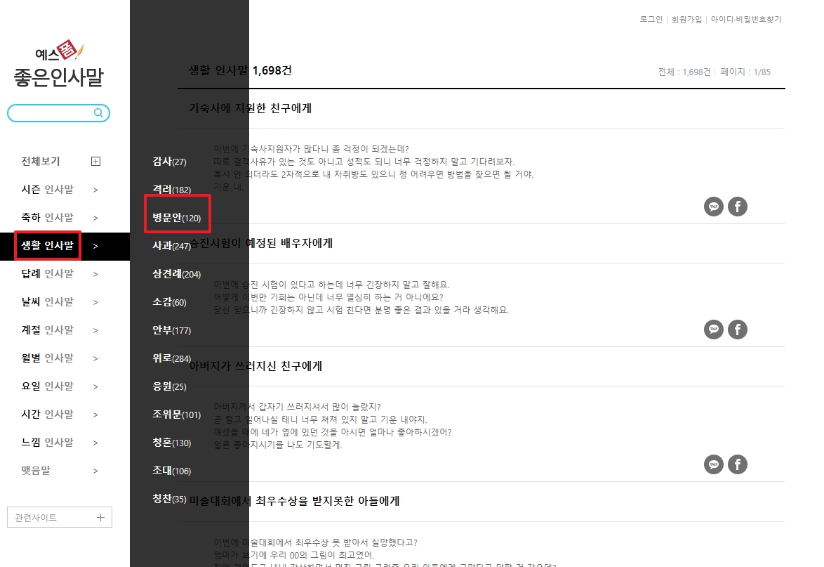 생활 인사말 메뉴에는 일상생활에서 필요한 다양한 인사말들이 정리되어 있습니다. 이 중 병문안 항목을 찾아 클릭하면 병문안 관련 인사말 예시들을 볼 수 있습니다.