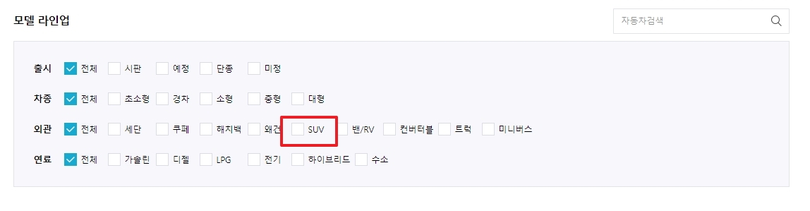 이 필터를 적용하는 순간, 현대자동차의 모든 SUV 라인업만 깔끔하게 정렬돼서 나와요. 이게 우리가 원했던 정보죠.