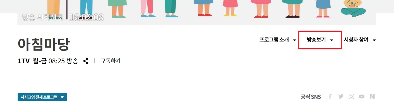 만약 지난 회차를 골라서 보고 싶다면, 프로그램 제목 오른쪽에 있는 '방송보기' 메뉴를 찾아야 해요. 이 메뉴를 클릭하면 '다시보기', '예고' 같은 하위 메뉴들이 쭉 펼쳐지는데, 우리는 '다시보기'를 선택하면 된답니다.