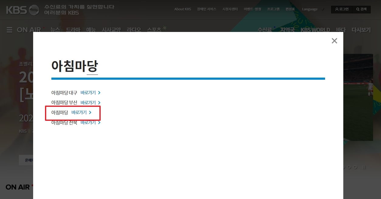 입력한 뒤에 바로 엔터를 쳐도 되지만, 검색어 아래에 뜨는 '아침마당' 프로그램 이름 옆에 '바로가기' 버튼이 보일 거예요. 이걸 클릭하면 해당 프로그램의 전용 페이지로 한 번에 이동할 수 있어서 훨씬 편리하답니다.