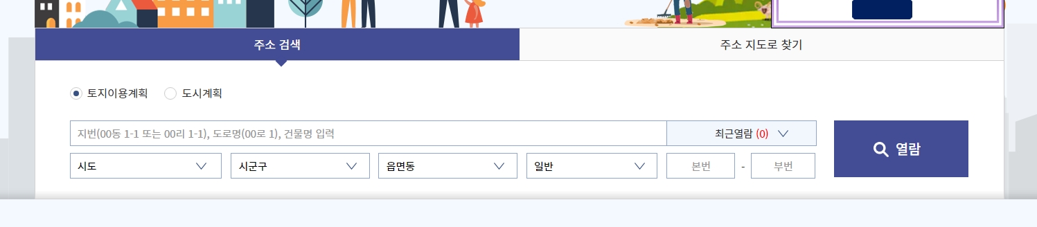 보이는 것처럼 메인 화면에 바로 주소를 입력할 수 있는 검색창이 있어요. 여기에 궁금한 땅의 지번이나 도로명 주소를 입력하고 '열람' 버튼만 누르면 끝이에요. 정말 간단하죠? 따로 회원가입이나 로그인도 필요 없어서 편하더라고요.
