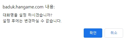 마지막으로 대국실에서 사용할 '대국명(닉네임)'을 입력해야 하는데요, 이 부분에서 주의하셔야 할 점이 하나 있어요. 한번 설정한 대국명은 절대로 변경할 수 없습니다.