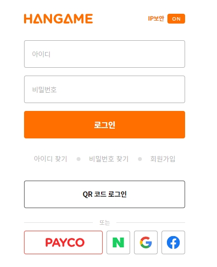 입장하기를 누르면 로그인을 하라는 창이 뜨는데요, 여기서 많은 분들이 "아, 또 가입해야 하나?" 하고 귀찮아하시더라고요. 그런데 걱정하지 않으셔도 되는 게, 굳이 한게임 전용 아이디를 만들 필요가 없어요.