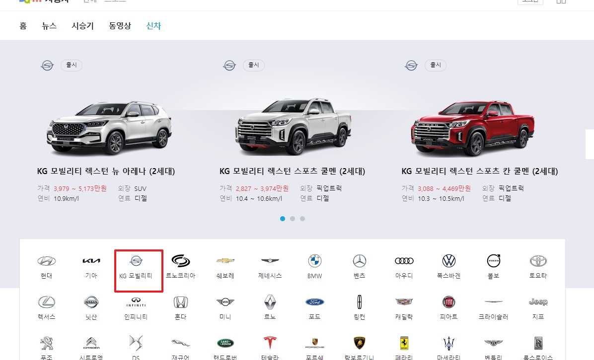 새로운 페이지에서 KG 모빌리티라는 회사명을 클릭합니다. KG 모빌리티는 쌍용차의 모델 및 브랜드 정보를 제공하는 공식 대표 회사입니다.