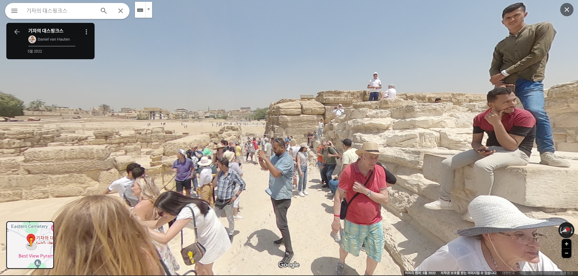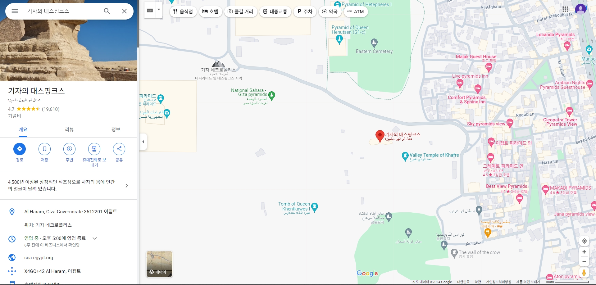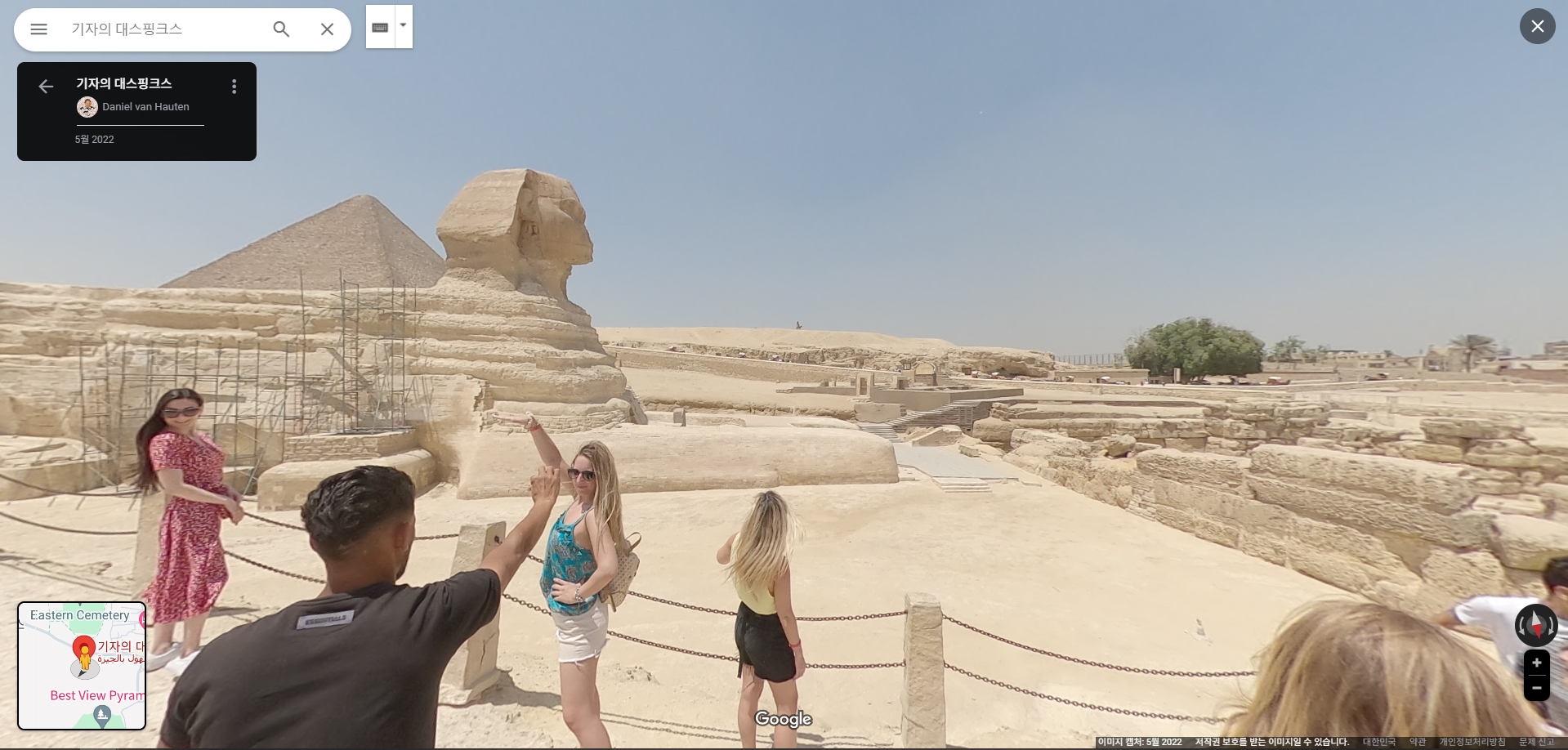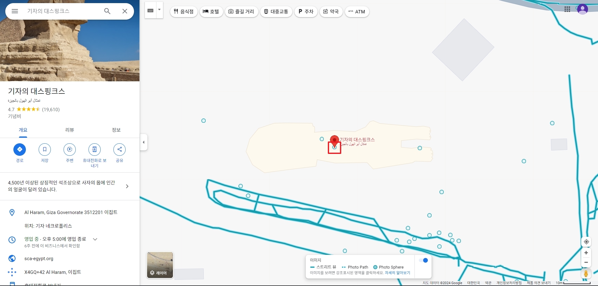스트리트뷰를 통해 실제 스핑크스를 볼 수 있으며, 관광객들이 있는 현장감 넘치는 사진을 확인할 수 있습니다. 이 기능은 마치 현장에 있는 것처럼 주변 환경을 체험할 수 있게 해줍니다.
