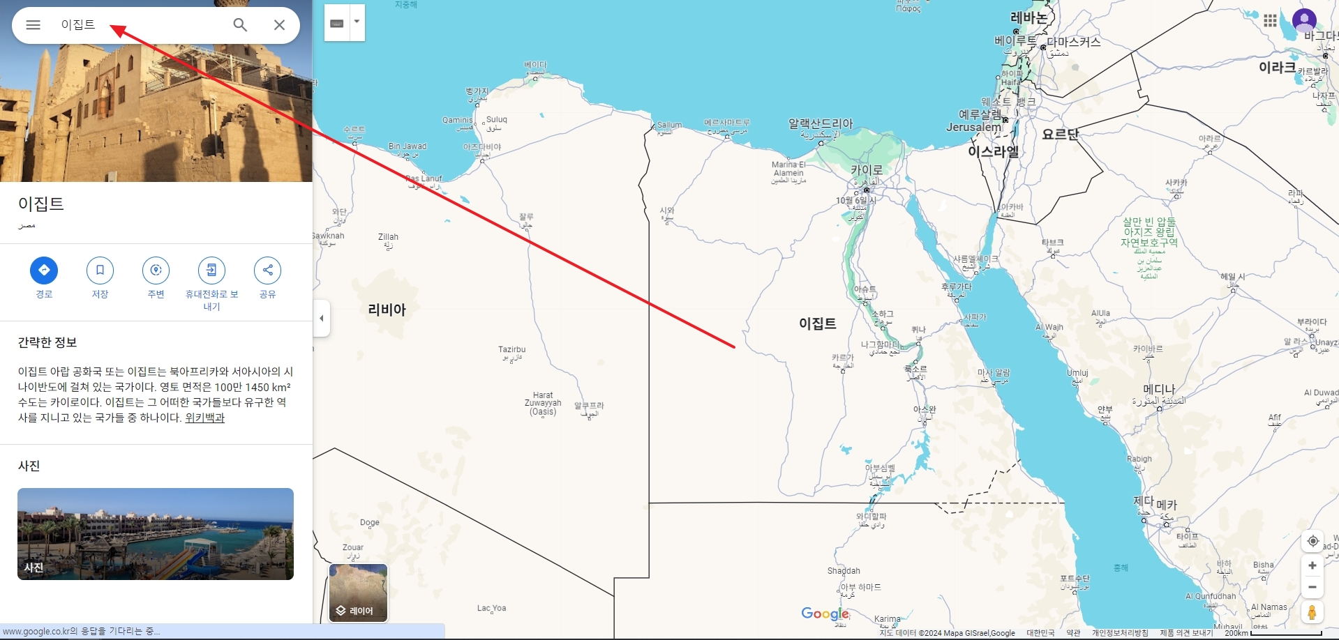 좌측 상단의 검색창을 이용해 원하는 나라를 검색할 수 있습니다. 예를 들어, 이집트를 검색하면 빠르게 이집트 지역으로 이동할 수 있습니다. 검색 기능을 통해 특정 나라나 지역을 신속하게 찾아볼 수 있는 것이 구글지도의 장점 중 하나입니다.